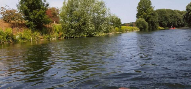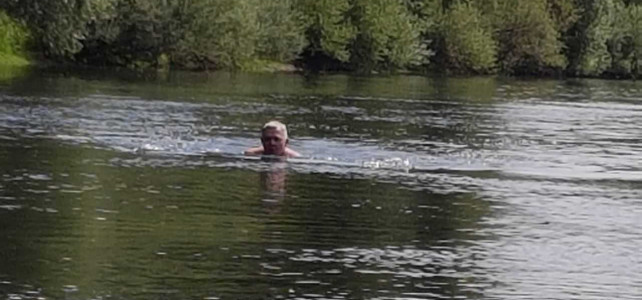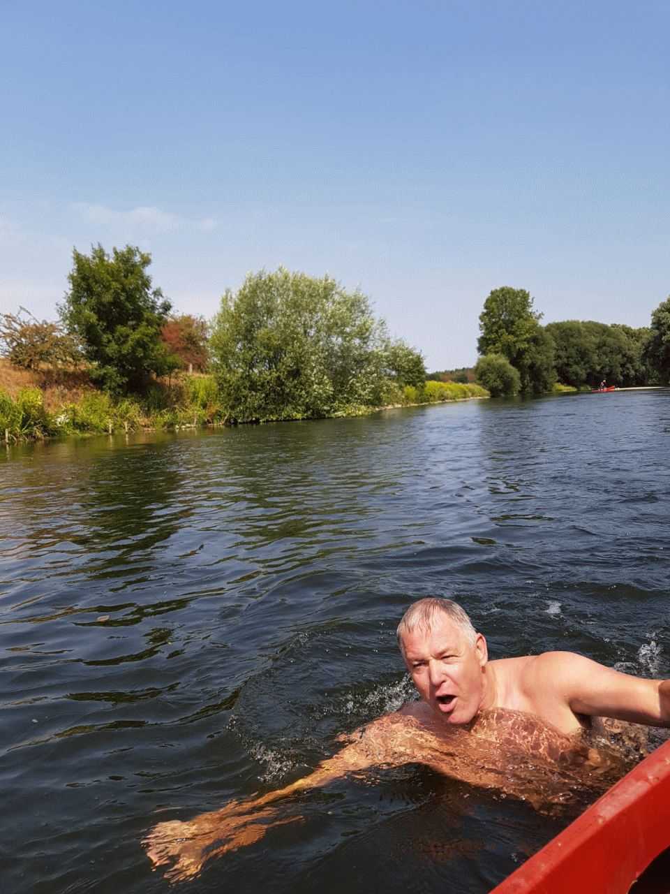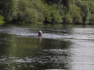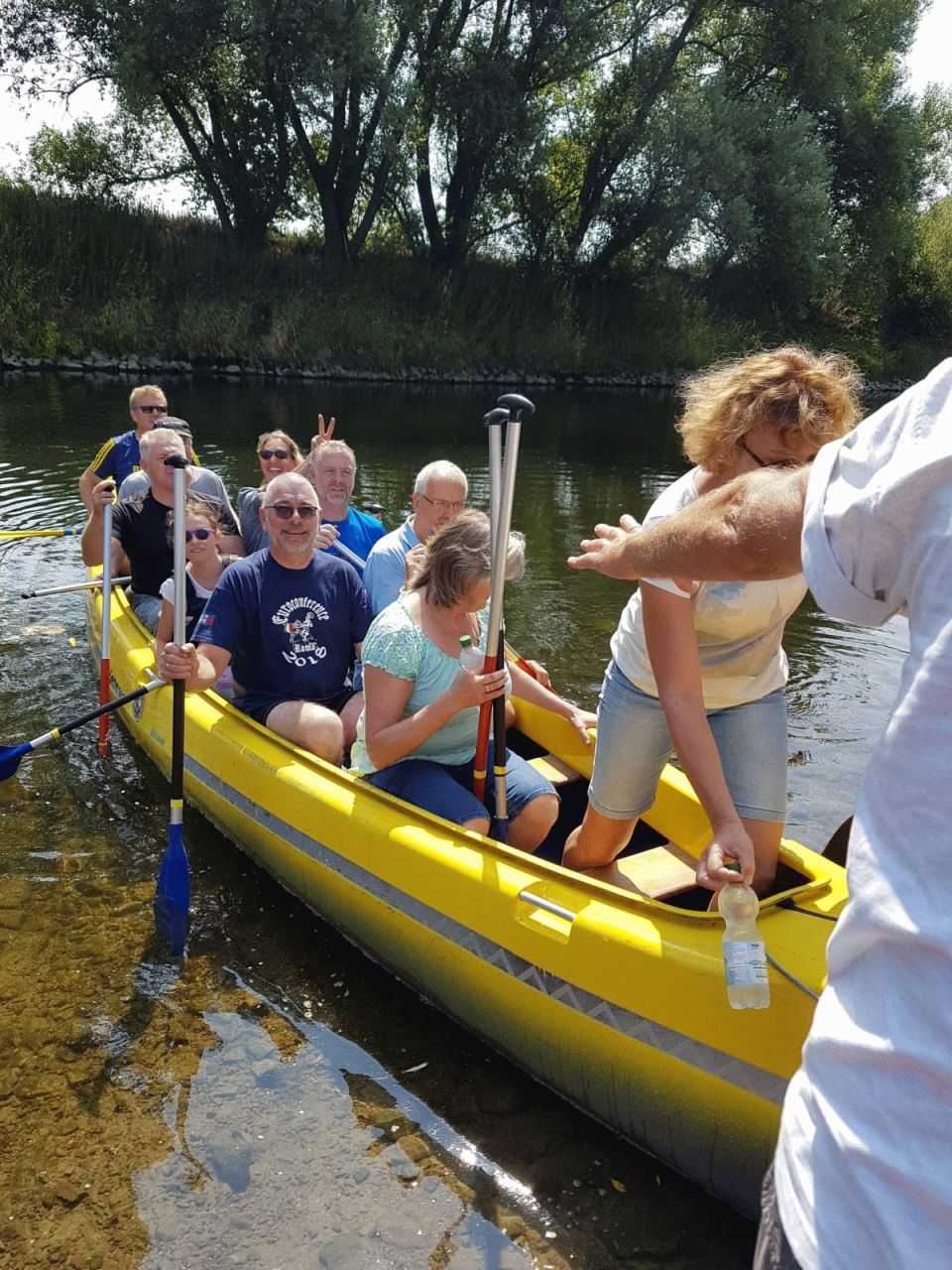Im Bereich Obrighoven erreichten wir die Lippefähre und es stand eine Pause an. TomTom, Hans und Udo erwarteten uns mit kühlen Getränken. Nach einer kurzen Rast ging es dann weiter. Kurz nach der Abfahrt kam es zu einem Zwischenfall: Jürgen ging über Bord. Das sah aber ziemlich freiwillig aus, wahrscheinlich hatte er keine Lust mehr zu paddeln. Jedenfalls blieb er den Rest der Tour im Wasser und ließ sich durch die Strömung treiben. Rettungsversuchen widerstand er hartnäckig und erfolgreich. Auf Grund des niedrigen Wasserstandes bestand auch nicht unbedingt Lebensgefahr. Also ließen wir ihn treiben.